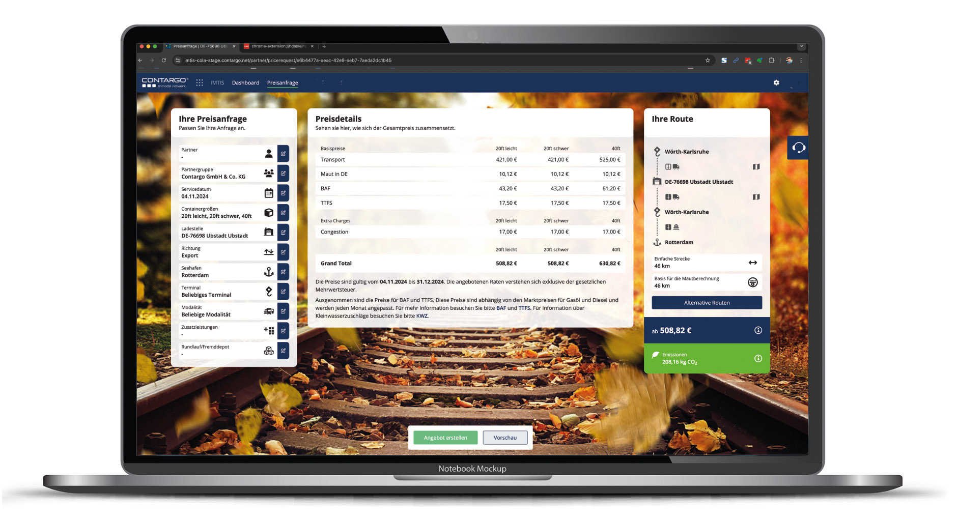 - Preisanfragen stellen, inklusive der Berechnung von CO₂-Emissionen.